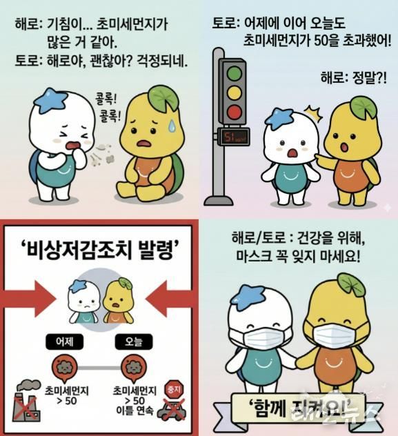 또한, 미세먼지 취약계층의 건강 보호를 위해 시 누리집, 버스정보안내 전광판, 대기환경 전광판 등을 활용해 비상저감조치 발령 상황을 신속히 알리고, 시민들이 고농도 미세먼지 행동요령을 숙지할 수 있도록 홍보를 강화했다. 아울러 관련 부서와 협력해 복지시설과 다중이용시설 점검을 강화하는 등 취약계층 보호를 위한 대응에도 나서고 있다.