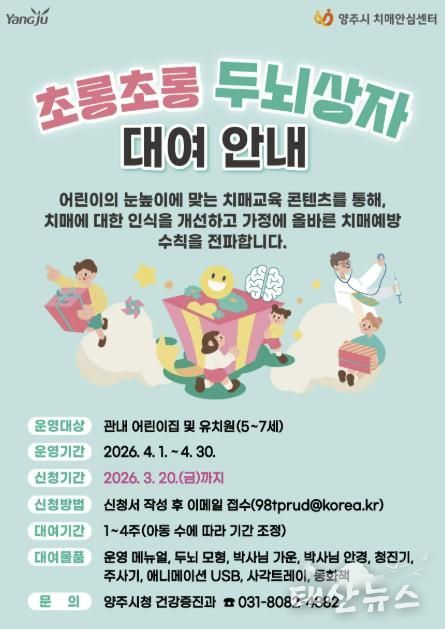 태산뉴스 이동욱 기자 | 양주시서부치매안심센터는 어린이 대상 치매 인식개선사업인 ‘초롱초롱 두뇌상자’ 대여사업을 운영한다. 이번 사업은 어린이들의 눈높이에 맞춘 치매 교육을 통해 치매에 대한 올바른 이해를 돕고, 가족 내 치매 예방 실천 문화를 확산하기 위해 마련됐다.
