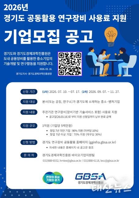 태산뉴스 김준수 기자 | 경기도와 경기도경제과학진흥원이 도내 중소·벤처기업의 연구개발(R&D) 경쟁력 강화를 위해 ‘2026년 경기도 공동활용 연구장비 사용료 지원 사업’을 추진한다.