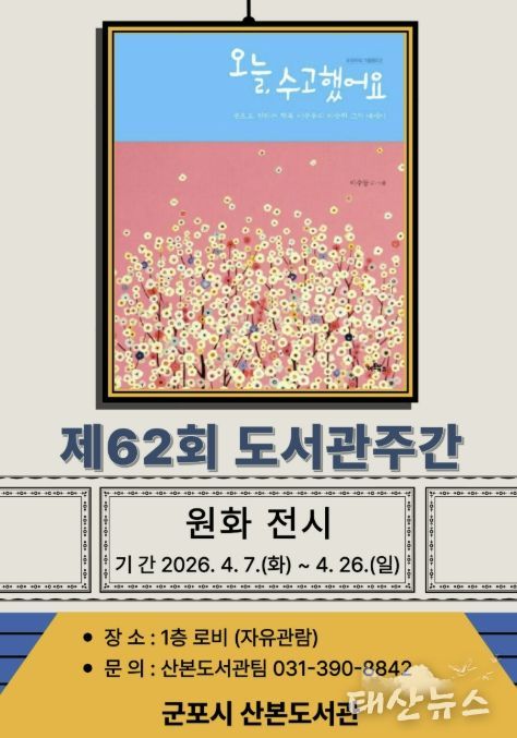 태산뉴스 이동욱 기자 | 군포시 산본도서관은 도서관주간을 맞아 시민들의 독서문화 확산과 책을 통한 공감의 시간을 마련하기 위해 작가와의 만남, 북토크, 원화전시 등 다양한 프로그램을 운영한다.