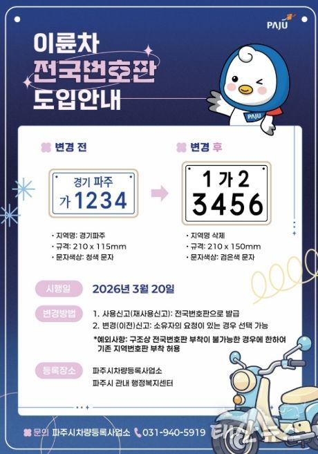 태산뉴스 이동욱 기자 | 파주시는 오는 20일부터 이륜차 전국번호판 제도를 본격 시행한다.