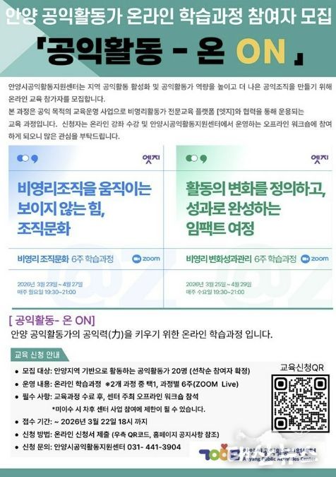 태산뉴스 이동욱 기자 | 안양시공익활동지원센터가 지역 공익활동가들의 철학적 토대를 다지는 교육을 성공적으로 마친 데 이어, 실천적 전문성을 높이기 위한 온라인 교육 과정을 본격 가동하며 활동가 지원에 박차를 가하고 있다.