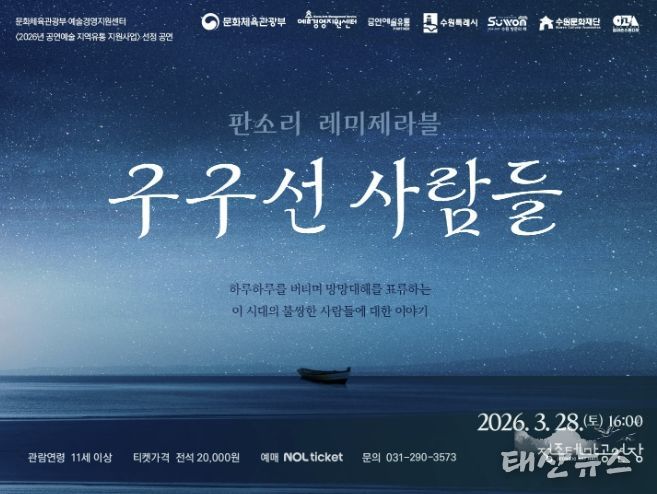수원문화재단은 정조테마공연장에서 오는 28일 오후 4시, 문화체육관광부와 예술경영지원센터의 ‘2026 공연예술 지역유통 지원사업’ 선정작인 ‘판소리 레미제라블 '구구선 사람들'’을 선보인다.