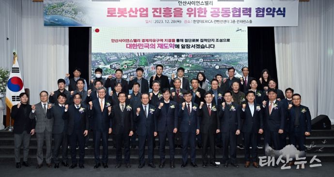 태산뉴스 이동욱 기자 | 안산시는 지난 28일 대한민국 로봇·제조 산업을 이끄는 11개 관련기관과 ‘안산사이언스밸리 경제자유구역 후보지 로봇산업 진흥을 위한 공동협력 협약’을 체결했다고 29일 밝혔다.