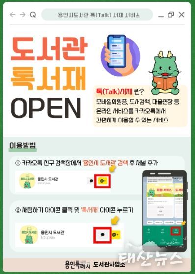 태산뉴스 이동욱 기자 | 용인특례시는 이달부터 모바일 메신저 카카오톡을 기반으로 한 ‘톡(Talk) 서재 서비스’를 시작한다고 2일 밝혔다.