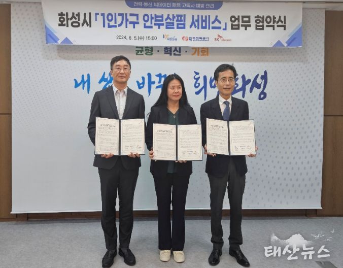 태산뉴스 이지율 기자 | 화성시가 5일 한국전력공사·SK텔레콤과 전력‧통신 빅데이터를 활용한 ‘1인가구 안부살핌 서비스’ 제공을 위한 업무 협약을 체결했다.