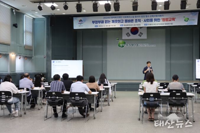 태산뉴스 이지율 기자 | (재)평택복지재단(이사장 임종철)은 6월 28일 팽성복지타운 2층 대강당에서 사회복지시설 종사자 법정 필수 교육사업 5회기'청렴교육'을 진행했다.