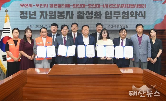 태산뉴스 이동욱 기자 | 오산시는 23일 시청 상황실에서 오산시 청년협의체, 한신대학교, 오산대학교, (사)오산시자원봉사센터 등 5개 기관과 '청년 자원봉사 활성화를 위한 업무협약'을 체결했다.
