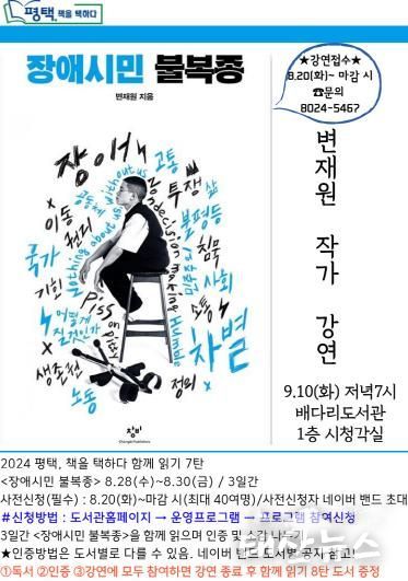 태산뉴스 이동욱 기자 | 평택시 배다리도서관은 '장애시민 불복종' 변재원 작가 강연을 다음 달 9월 10일 화요일 저녁 7시 1층 시청각실에서 진행한다.