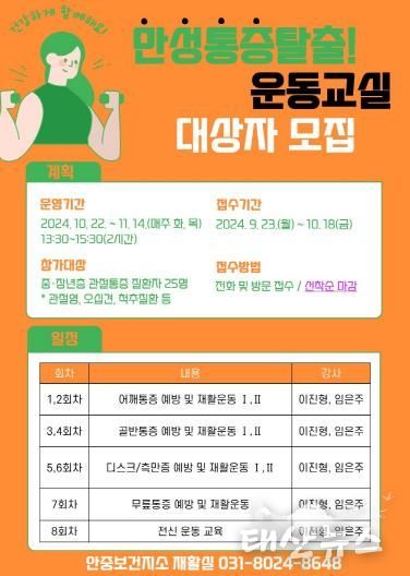태산뉴스 이지율 기자 | 평택시 안중보건지소는 근골격계 통증을 호소하는 중장년층 지역주민을 대상으로 ‘만성통증탈출 운동교실’ 프로그램을 오는 10월 22일부터 11월 14일까지 매주 화·목요일 13:30~15:30 총 8회에 걸쳐 진행한다.
