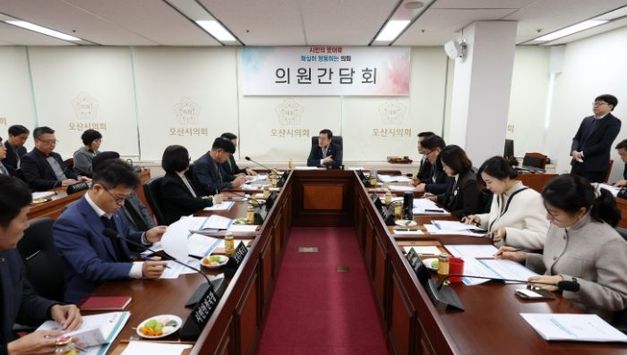 태산뉴스 김준수 기자 | 오산시의회는 14일 의회 제2회의실에서 의원간담회를 열고 오는 25일부터 진행되는 제298회 제2차 정례회 상정 안건과 향후 의정활동 계획을 논의했다. 이번 간담회는 정례회를 앞두고 예산안과 조례안 등 주요 안건을 사전에 점검하고 시민 생활과 직결된 현안을 살피기 위해 마련된 것으로, 이날 회의에서는 이달 25일부터 다음달 19일까지 25일간 진행되는 정례회 운영계획을 집중 논의했다. 이번 정례회에는 ▲예산안 4건 ▲조례안 11건 ▲보고사항 3건 ▲기타안건 4건 등 모두 22건의 부의안건이 상정될 예정이다. 의원발의 조례안에는 ▲'오산시 도로와 다른 시설의 연결에 관한 조례 일부개정조례안'(이상복 의원) ▲'오산시 도시계획 조례 일부개정조례안'(조미선 의원) ▲'오산시 공공시설 내 최적의 장애인관람석 지정 설치·운영 조례 전부개정조례안'(전예슬 의원) 등이 포함돼 도시계획, 교통·시설 접근성, 장애인 문화 향유권 등 시민 삶 전반의 제도 개선을 도모한다. 이상복 의장은 “제298회 정례회는 내년 시정의 밑그림을 그리는 중요한 회기인 만큼 시민 삶에 영향을 미치는 모든 안건을