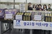 태산뉴스 이동욱 기자 | 영통구 광교1동은 지난 2월 11일, 설 명절을 앞두고 관내 단체와 기관의 따뜻한 나눔이 이어지는 가운데 ‘설 명절 이웃나눔 전달식’을 개최했다고 밝혔다. 광교1동에 따르면, 이번 전달식에는 동남용역이 후원한 햄 40세트와 시립광교동어린이집에서 정성껏 준비한 생필품 꾸러미 40박스가 전달됐다. 또한 광교1동 지역사회보장협의체에서 마련한 후원금과 광교1동 공동모금회를 통해 준비된 떡국떡, 전, 나물, 과일 등 명절 음식도 함께 전달돼 뜻깊은 의미를 더했다. 특히 이번 나눔은 기업과 보육기관, 지역 복지단체가 한마음으로 참여해 설 명절을 앞두고 소외되기 쉬운 이웃들에게 따뜻한 정을 전하며 지역사회에 훈훈한 분위기를 조성했다. 광교1동은 이날 전달된 성금과 물품을 저소득 가정과 취약계층, 홀몸 어르신 등 도움이 필요한 이웃들에게 전달해 따뜻하고 풍성한 설 명절을 보낼 수 있도록 지원할 예정이다. 송숙영 광교1동장은 “설 명절을 맞아 어려운 이웃을 위해 소중한 정성을 모아주신 모든 분들께 깊은 감사의 말씀을 드린다”며, “전달받은 성금과 물품은 꼭 필요한 이웃들에게 정성껏 전달해