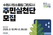 태산뉴스 이동욱 기자 | 수원특례시가 ‘생활 속 탄소중립 실천’을 확산하기 위해 2월 12일부터 20일까지 탄소중립 그린도시 사업 대상지 주민·생활권자를 대상으로 ‘수원시 탄소중립 그린도시 주민실천단’ 신규 참여자를 모집한다. 주민실천단은 탄소중립 그린도시 사업 대상지 주민과 생활권자로 구성된 시민 참여 조직이다. 지역 내 탄소중립 실천 활동과 홍보, 주민 참여 활동 등을 한다. 특히 수원시는 올해 주민실천단을 70명 규모로 확대 운영할 계획이다. 지난해 운영 성과를 바탕으로 신규 참여자를 모집해 참여 기반을 넓히고, 일회성 캠페인을 넘어 생활 속 실천이 자연스럽게 이어지는 탄소중립 문화를 확산할 계획이다. 모집 대상은 고색동·오목천동·탑동·서둔동·호매실동·평동·평리동 일부 등 탄소중립 그린도시 사업 대상지 거주민과 해당 지역 생활권자다. 주민실천단은 자원봉사 형태로 활동하며 ▲생활 속 탄소 저감 실천 ▲지역 맞춤형 실천 활동 ▲탄소중립 실천 홍보 ▲분과 활동, 회의 ▲역량 강화 교육 등에 참여한다. 수원시는 탄소중립 그린도시 주민실천단 확대 운영에 맞춰 참여자 역량을 높이는 교육과 분