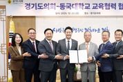 태산뉴스 김준수 기자 | 경기도의회는 23일 오전 의장 접견실에서 동국대학교와 교육협력 및 학술교류를 위한 업무협약(MOU)을 체결했다. 이날 협약식에는 김진경 의장(더민주, 시흥3)과 고준호 의원(국민의힘·파주1), 김완규 의원(국민의힘·고양12), 이병숙 의원(더민주·수원12), 박호순 의정국장이 참석했다. 동국대학교에서는 윤재웅 총장, 김용현 교무부총장, 김승용 대학원장, 유한림 BMC(바이오메디캠퍼스) 행정처장 등이 함께 자리해 협약의 의의를 더했다. 양 기관은 이번 협약을 계기로 ▲의정 발전을 위한 정보 교류 ▲전문 인재 양성을 위한 교육·연구 지원 ▲도의원 및 의회 직원 대상 대학원 장학금 지원 등 의정 활동 역량 강화를 위한 체계적인 교육 협력에 나서기로 했다. 윤재웅 총장은 “대학의 교육·연구 역량을 공유함으로써 경기도 발전에 기여할 수 있게 되어 뜻깊다”며 “경기도의회와의 지속적인 협력을 통해 실효성 있는 교육 지원을 이어갈 수 있도록 최선을 다하겠다”라고 말했다. 김진경 의장은 “의회에 대한 도민의 기대는 점점 더 복잡해지고 다양화되고 있는 만큼 의회 구성원 모두가 더