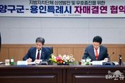 태산뉴스 이동욱 기자 | 용인특례시는 6일 강원특별자치도 양구군과 자매결연을 하고, 두 도시의 교류와 발전을 위해 적극 협력하기로 했다. 이상일 시장은 이날 양구군청 중회의실에서 서흥원 군수와 두 도시 간 우의를 증진하고 상호 교류‧협력하는 데 합의하고, 자매결연 협약서에 서명했다. 이번 협약으로 양구군은 시의 16번째 자매도시가 됐다. 이상일 시장은 “양구는 문화예술 분야에서 과감한 투자를 하고 있고, 양구군립박수근미술관은 2023년 양구 출신 박수근 화백의 1956년 작품 ‘가족’을 품었는데 두 도시가 앞으로 가족처럼 잘 지냈으면 한다”며 “이번 협약을 계기로 양 도시가 협력을 강화해서 함께 발전하길 기원한다”고 말했다. 이 시장은 “양구군과 용인시의 훌륭한 농산물들이 양 도시에서 소비하도록 서로 홍보하는 등 협조 체계를 갖추는 노력도 기울이자"라며 "양구에는 테니스장, 축구장 등 스포츠 시설이 아주 잘 갖춰져 있는 만큼 용인의 스포츠팀이나 단체들이 양구를 찾아 훈련하는 등 체육 분야의 협력도 도모하면 좋겠다"고 했다. 서흥원 군수는 “용인의 인프라와 비전이 대한민국 지방자치단체 중