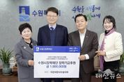 태산뉴스 이동욱 기자 | ㈜농협하나로유통 농협수원유통센터, ㈜더맛푸드, 수원지역건축사회, ㈜에듀케어, 팔색조봉사단, 이만세한식부봉사회 등 6개 기업·단체가 “지역 인재 양성에 사용해 달라”며 수원시장학재단에 총 4100만 원을 기탁했다. 기업·단체 대표들은 12일 수원시청을 방문해 수원시장학재단에 장학금을 전달했다. 전달식에는 이재준 수원시장, 수원시장학재단 박춘근 이사장, 노수용 사무국장 등이 참석했다. ㈜농협하나로유통 농협수원유통센터가 2000만 원, ㈜더맛푸드 1000만 원, 수원지역건축사회 500만 원, ㈜에듀케어 300만 원, 팔색조봉사단 200만 원, 이만세한식부봉사회가 100만 원을 각각 기부했다. ㈜농협하나로유통 농협수원유통센터는 2014년부터 올해까지 매년 2000만 원씩, 총 2억 4000만 원을 수원시장학재단에 기부했고, ㈜더맛푸드는 2년 연속 1000만 원을 기부했다. 민선홍 농협수원유통센터 지사장은 “지역사회와 함께 성장해 온 기업으로서, 지역의 미래를 이끌 인재 양성에 보탬이 되고 싶어 기부에 참여했다”며 “학생들이 꿈을 향해 한 걸음 더 나아가는 데 작은 힘이 되길 바란다