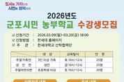 태산뉴스 이동욱 기자 | 군포시 도시농업 활성화 지원사업 보조사업자인 한세대학교가 오는 3월 20일까지 2026년도 군포시민 농부학교 신규 수강생을 모집한다고 밝혔다. 군포시민 농부학교는 군포시민들이 도심 속에서 직접 작물을 재배하며 친환경적인 삶의 태도를 함양하고, 이웃과 소통하는 공동체 문화를 회복하기 위해 마련됐다. 특히 단순한 농사 기술 습득을 넘어 이론과 실습이 병행된 체계적인 커리큘럼을 제공할 예정이다. 올해 모집 규모는 성인반 25구좌, 주말가족반 25구좌, 주말어린이반 20구좌로 총 70구좌이며, 교육은 한세대학교 내 위치한 도시농업지원센터 전용 농장에서 진행된다. 운영 기간은 3월부터 12월까지 약 10개월간이며 총 20강에 걸쳐 절기별 작물 재배법과 생태 교육 등 다채로운 프로그램이 이어진다. 신청 접수는 3월 9일부터 3월 20일까지 진행되며 자세한 커리큘럼 및 접수 방법은 한세대학교 홈페이지 공지사항을 통해 확인할 수 있다. 군포시 관계자는 “도시농업은 먹거리를 생산하는 즐거움을 넘어 기후 위기 시대에 탄소 중립을 실천하는 소중한 발걸음이 될 것”이라며 “많은 시민이 흙을 만지